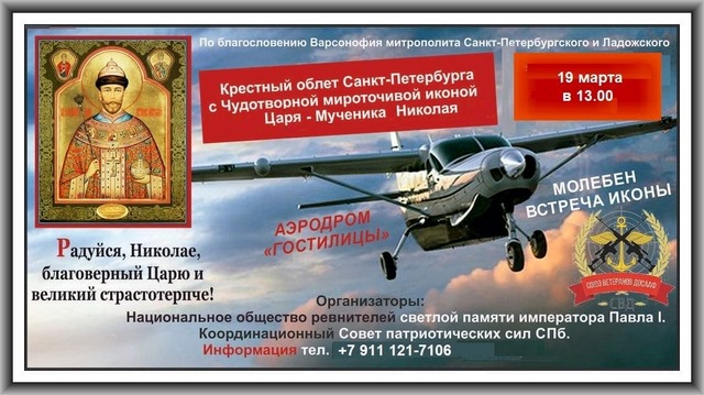 On March 19, 2020, the day of celebration of the icons of the Mother of God «Gracious Heaven» and «Czestochowa», the miraculous myrrh-streaming icon of Tsar Nicholas with the blessing of the Metropolitan of St. Petersburg and Ladoga Varsonofy, was encircled in a plane around St. Petersburg.